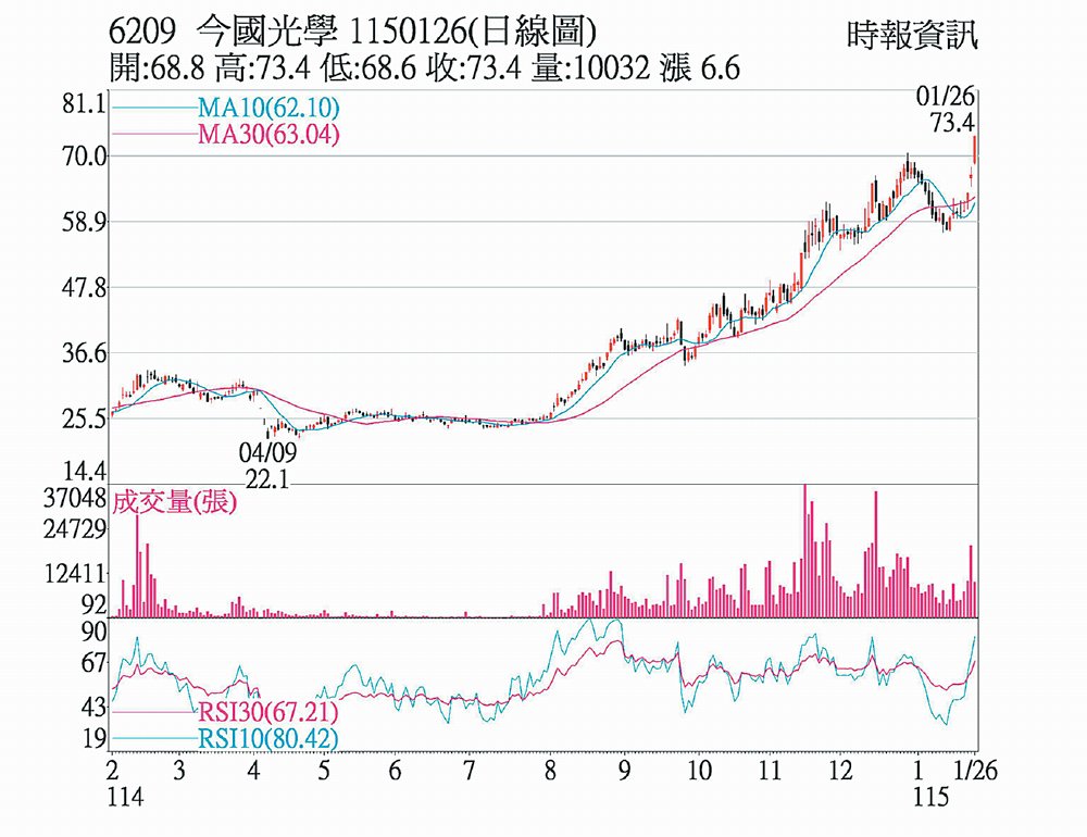 今國光(6209)挾AR眼鏡題材,吸引短多資金卡位,開盤後即攻上漲停價73.4元,創近20年來新高,成交量逾9,000張,漲停委買高掛1.2萬張。