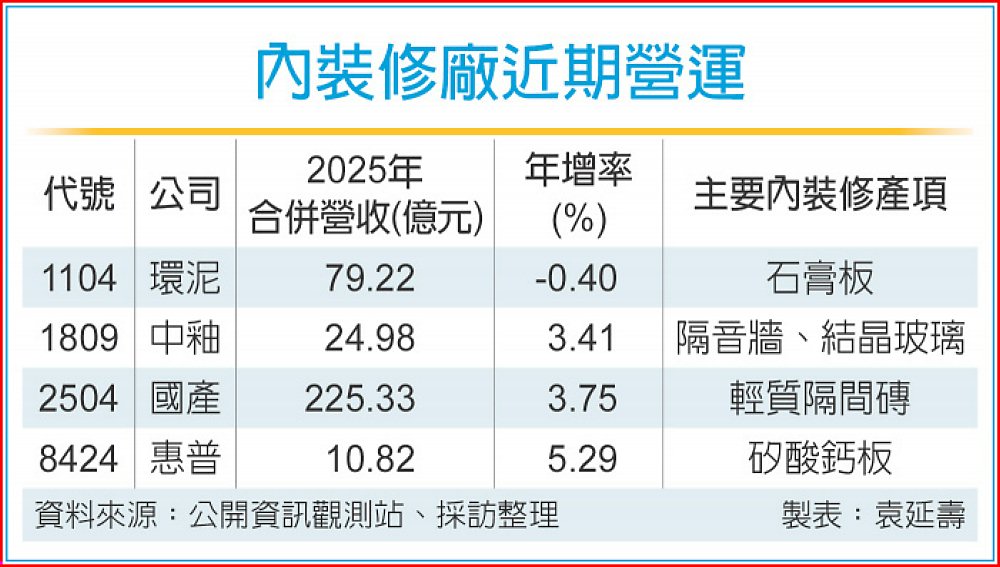 雖有政策打房干擾房地產的交屋量,但石膏板廠環泥(1104)、矽酸鈣板廠惠普(8424),以及國產(2504)轉投資國宇建材等內裝修建材廠預期,在科技廠辦、公共工程建案增加下,2026年營運應可以持穩增長。