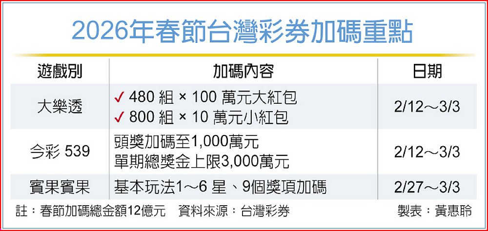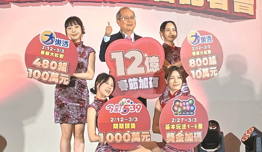 迎接金馬年新春,台灣彩券26日正式揭曉2026年春節彩券加碼活動內容,台彩總經理謝志宏表示,今年春節加碼總獎金規模一舉拉高至新台幣12億元,創下歷年新高,由大樂透、今彩539及「BINGO BINGO賓果賓果」三大遊戲同步加碼並自2月12日起一路加碼至元宵,陪伴民眾歡喜迎新春。