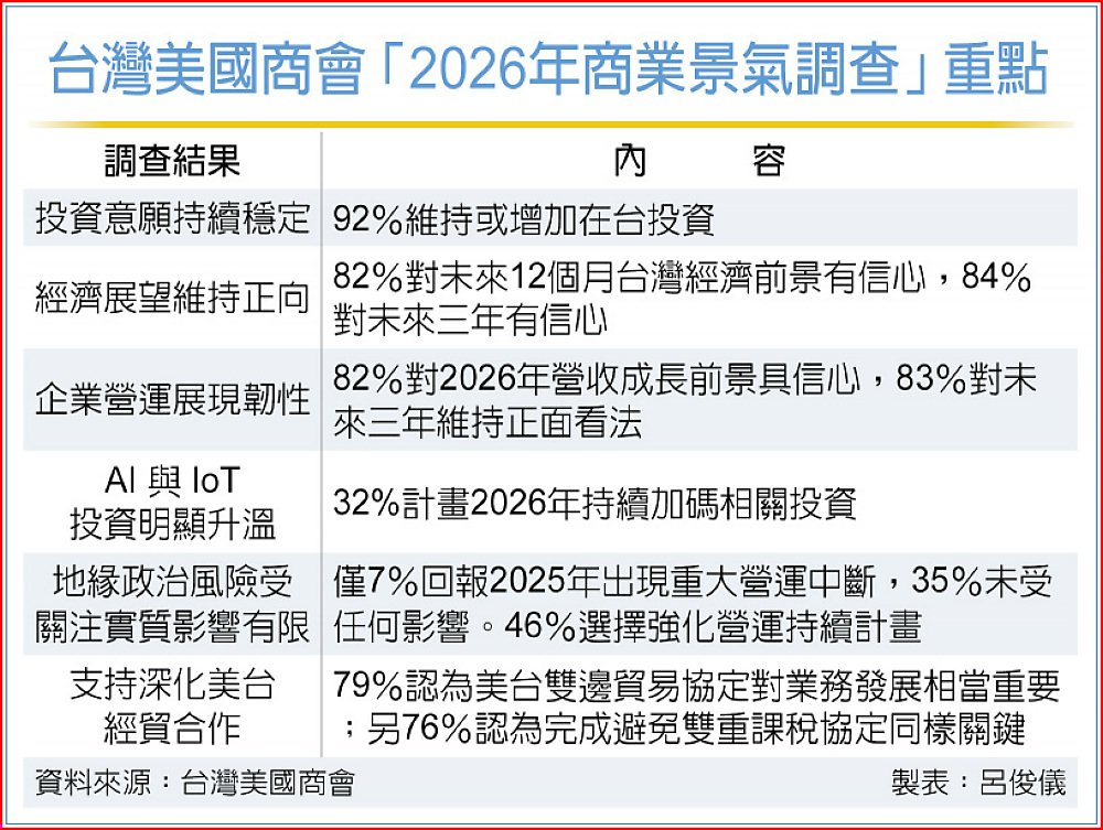 此外,台灣美國商會27日公布「2026商業景氣調查」,92%受訪會員企業計劃今年維持或增加在台投資。調查也顯示,有82%對未來一年台灣經濟前景有信心,對未來三年信心比率進一步提升到84%,年增7個百分點。