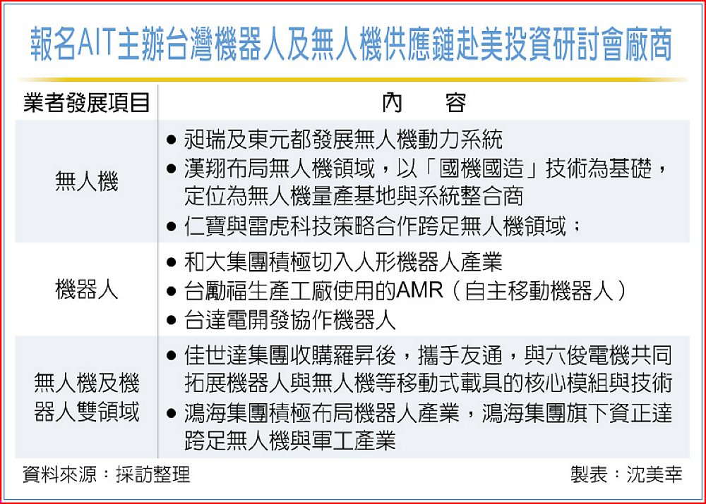 美國在台協會(AIT)為建立台美無人機供應鏈,主動出擊,28日在台中舉辦「台灣機器人及無人機供應鏈赴美投資研討會」,透過台灣AI機器人產業大聯盟向廠商廣發英雄帖,計有仁寶、台達電、漢翔、和大、鴻海、東元、鴻準等大廠約300人報名,呈現大爆棚的局面。