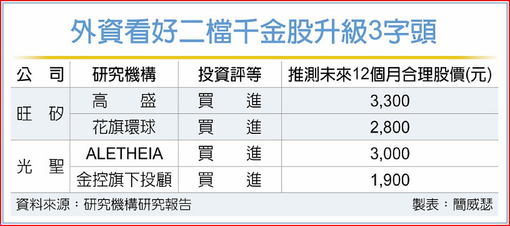 外資千金股再升級行情啟動,光聖獲調研機構ALETHEIA喊買、為外資第一家初評,給出3,000元推測合理股價,超越各投顧研究機構估值;高盛證券則大舉調高旺矽推測合理股價至3,300元;台股二檔千金股不寂寞,共同預約升級3字頭。