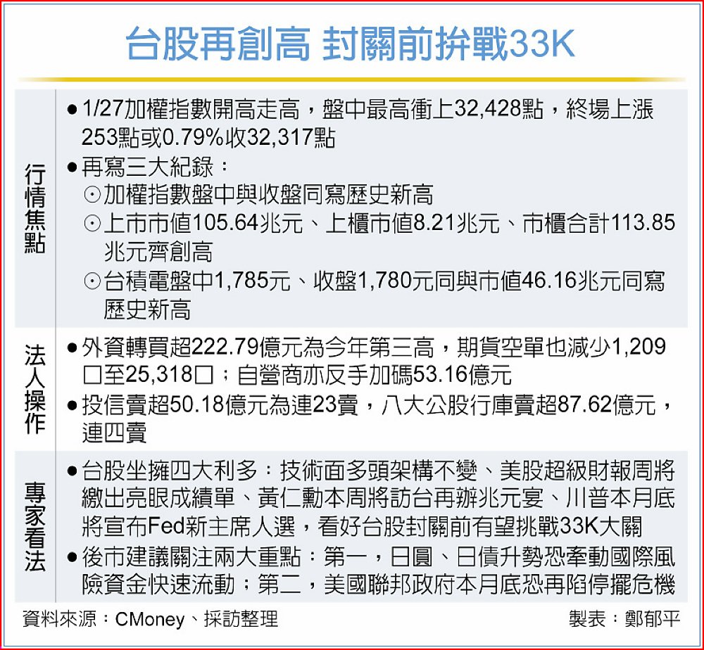 在外資大舉回補222.79億元與大型權值電子股領軍下,台股27日加權指數創高無極限,再寫三大紀錄,盤中最高衝上32,428點,終場上漲253點收32,317點,再創歷史新猷。