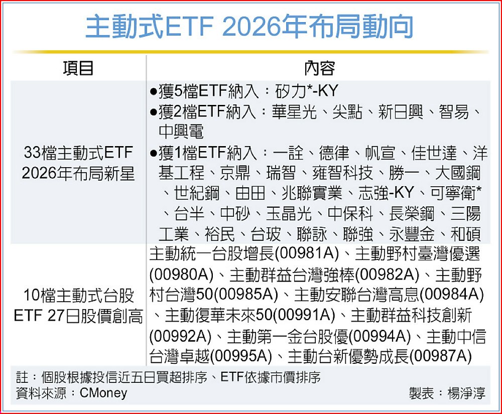 台股27日再刷歷史新高,10檔主動式台股ETF收盤也全數與台股一同攻上新高價,而隨著盤勢登高,主動式ETF經理人也積極進行「高檔換股秀」,2026年起共有33檔個股陸續被相中入列,包括矽力*-KY、華星光、尖點等,成為經理人後市看好的新布局名單。