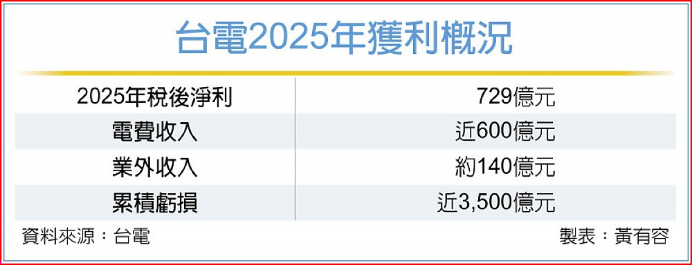 台電表示,2025年度稅後盈餘729億元,其中包含線路補助費、電網等業外收入約140億元,有近600億元為電業收入,與電業收入合理利潤近300億元相比,增加約300億元,主因為電費小幅調漲,及國際燃料價格較過去的高點降低、使成本減少。
