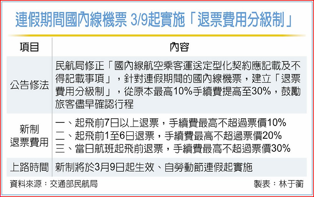 為提升機位使用率、鼓勵旅客儘早確認行程,交通部27日公告修法,針對連假期間的國內線機票實施「退票費用分級制」,於航班起飛前退票區分三個不同階段酌收費用,當日退票手續費最高將從10%增至30%,新制將於3月9日起生效、自勞動節連假起實施,旅客若因不可歸責因素無法搭機且提前通知,則免收退票手續費。