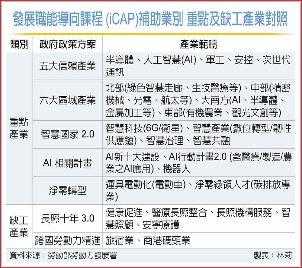 針對重點、缺工產業範疇,黃俐文指出,重點產業包含政策中的五大信賴產業、六大區域產業,以及生活圈的相關產業,例如半導體、人工智慧、安控、次世代通訊等;缺工產業則涵蓋長照、旅宿、商港碼頭業。