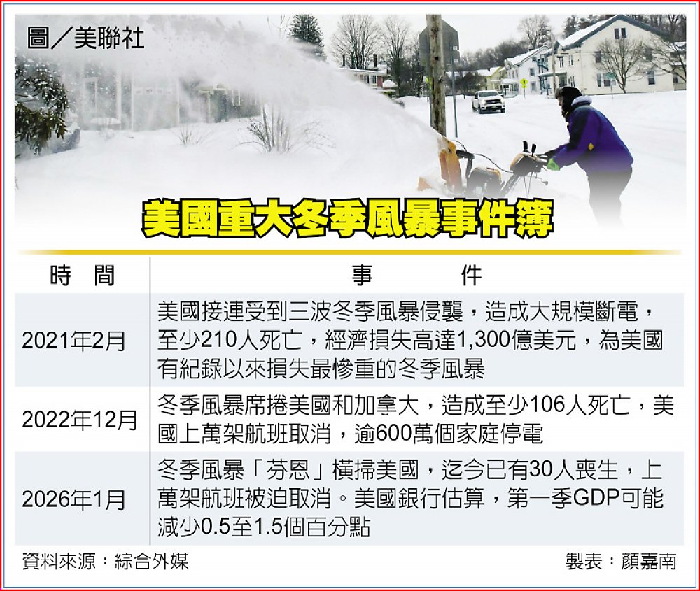 冬季風暴「芬恩」(Fern)近日橫掃美國,美國銀行(BofA)警告,冰風暴恐凍傷美國經濟,可能將第一季國內生產毛額(GDP)成長率至多削去1.5個百分點,投資人要到第二季才能迎來春燕。