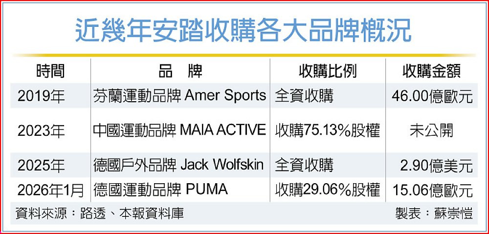 科創板日報報導,安踏在港交所發公告指出,此次交易對象為皮諾(Pinault)家族的投資公司Groupe Artemis。安踏表示,收購資金將全數由集團內部的現金儲備支應,預計於2026年底前完成交易。交易完成後,安踏將成為PUMA的重要戰略股東,但強調目前不會觸發全面收購計畫,將維持PUMA品牌營運的獨立性。