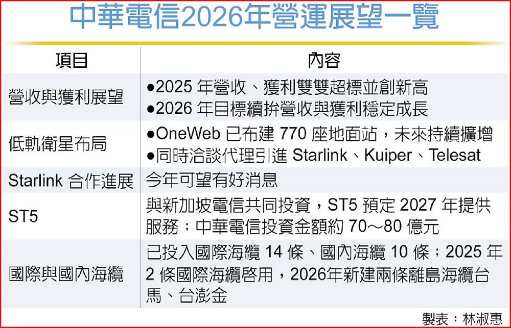 另外中華電信與新加坡電信合作多年的ST2已服務多年,中華電信亦確定與新加坡電信合作下一代衛星ST5,簡志誠並透露,ST5預定2027年提供服務。ST5由中華電信與新加坡電信共同投資,簡志誠說,中華電信投資金額估計70~80億元。