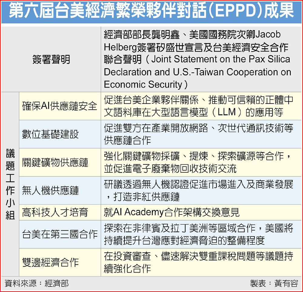 經濟部指出,台美雙方在本屆EPPD會議針對促進AI供應鏈發展、數位基礎建設、關鍵礦物供應、無人機供應鏈、高科技人才培育、台美在第三國合作及雙邊經濟合作等七個領域深入討論。自2020年以來已舉行六輪對話。