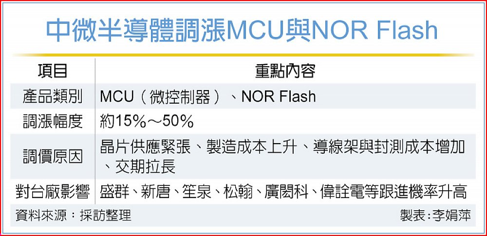 市場法人預期,台系MCU廠包括盛群、新唐、笙泉、松翰、廣閎科及偉詮電等,跟進機率明顯升高,成熟製程晶片漲價趨勢逐步成形。