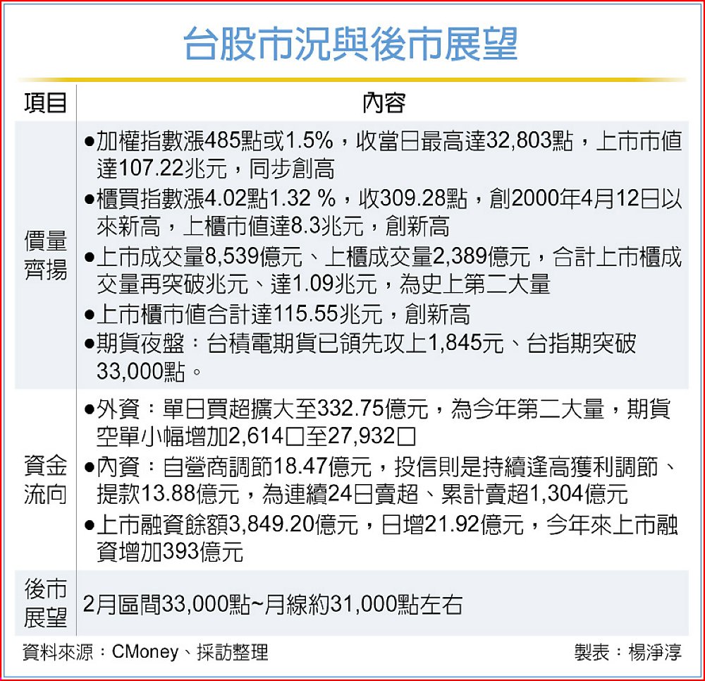 呂仁傑強調,由於股市短線漲多,融資增加過快,加上美國冰風暴、槍擊案,引發政府部分停擺的可能升溫、關稅風險也仍存有不確定因素,受此影響,台股不排除觸頂後會轉為高檔震盪,且距離封關僅剩下10個交易日,接近封關時點觀望氣氛可能升溫,2月區間看33,000點~月線31,000點左右。