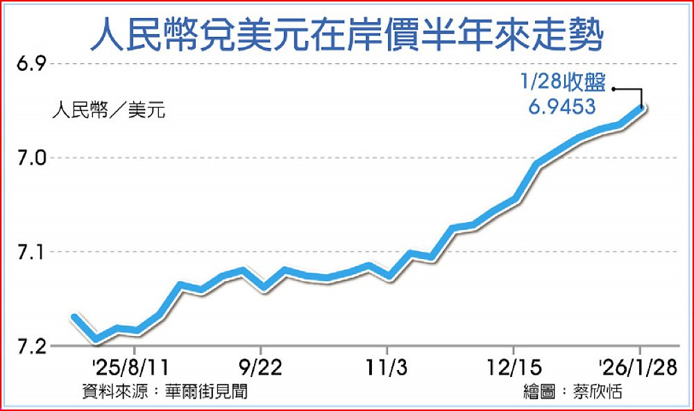 綜合外媒報導,中間價大漲激勵即期市場同步走揚,人民幣兌美元在岸價28日升破6.95元大關,官價收報6.9453元,單日升123個基本點,續創逾兩年半高。離岸價盤中更一度升破6.93元關口,來到6.9298元。