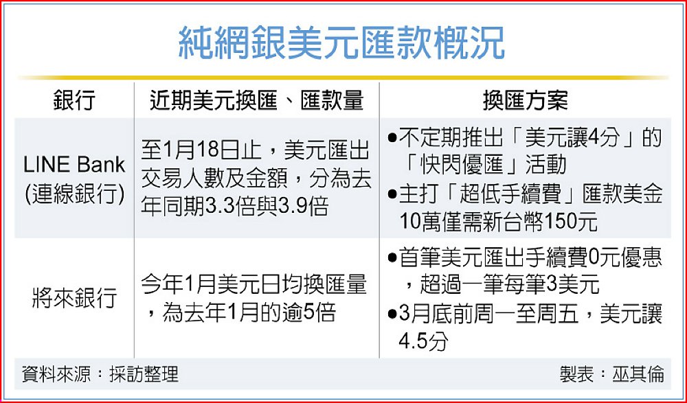 其他兩大純網銀將來銀行方面,則有首筆美元匯出手續費0元優惠,超過一筆則是每筆3美元,3月底前周一至周五,美元讓4.5分。