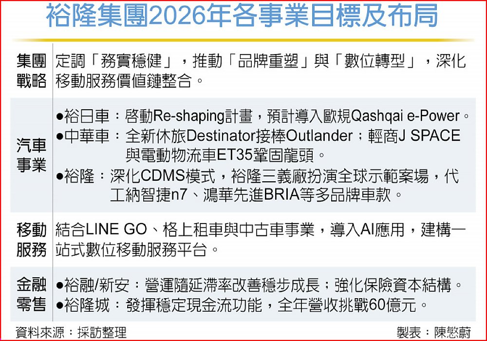 裕隆集團挺過雙稅(關稅、貨物稅)亂流,旗下各上市公司2025年有望全數獲利,展現營運韌性。裕隆集團執行長嚴陳莉蓮近日定調,2026年經營策略將以務實穩健經營為主軸,全力推動「品牌重塑」、「數位轉型」,深化「車輛製造到移動服務」的產業價值鏈整合,各公司樂觀今年業績穩增。