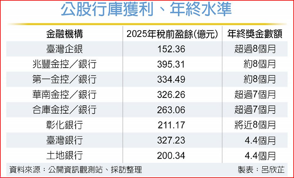 八大公股金融機構2025年獲利同創新高,連帶讓年終獎金出現好薪情。依公股金融機構28日在立法院財委會答覆立委的結果,兆豐金、第一金、彰銀、臺企銀平均年終獎金上看8個月,華南金、合庫金約7個多月,台灣金控與土銀因受國營事業管理法規範,最高4.4個月。