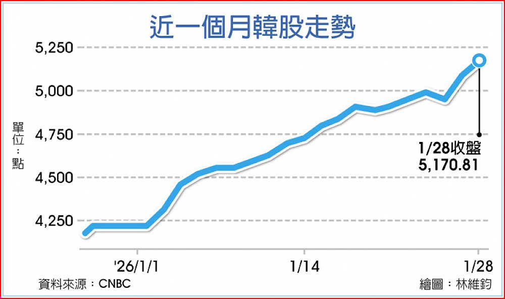 川普26日以韓國遲遲未能批准韓美貿易協議為由,揚言要將韓國關稅由15%調高至25%,不過次日川普的態度隨即放軟,表示會想出解決辦法,刺激韓股28日開高走高,指標Kospi指數盤中最高來到5,183.44點,終場收在5,170.81點,漲幅達1.69%。