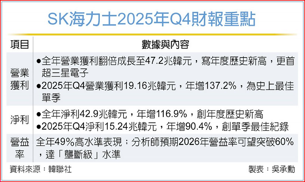 第四季單季表現上,SK海力士的營業獲利為19.16兆韓元,年增137.2%;淨利則是高達15.24兆韓元,年增90.4%,雙雙創下歷史最佳單季表現。