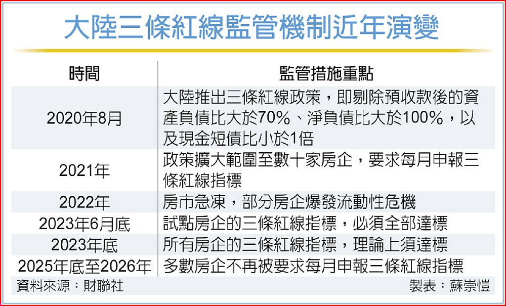 該政策原先要求試點房企在2023年中以前全部達標,但在2022年房市進入急凍期後,許多業者爆發流動性危機。隨著市場環境改變,這套以「限制擴張」為核心的監管工具,其階段性任務顯然已發生變化,不再作為主要的指導手段。
