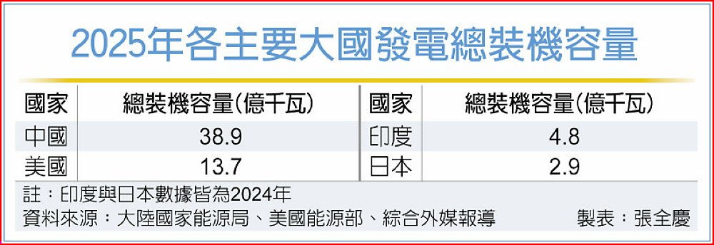據美國官方公開數據,美國2025年的總發電容量僅約13.7億千瓦,而大陸2025年的總發電裝機容量就接近於美國的三倍。並且,自2022年的25.6億千瓦至2025年的38.9億千瓦,大陸這四年間的新增裝機容量,就相當於美國2025年的總發電裝機容量。