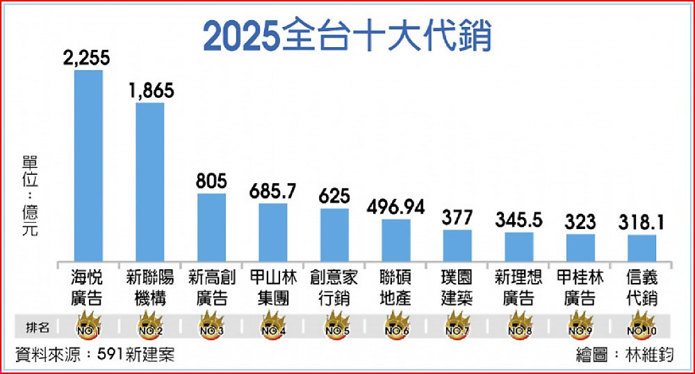統計顯示,2025年全台十大代銷依序為海悅廣告、新聯陽機構、新高創廣告、甲山林集團、創意家行銷、聯碩地產、璞園建築團隊、新理想廣告、甲桂林廣告、信義代銷,十大代銷接案總銷金額逾8,096億元,較2024年萎縮逾1成,反映去年房市在政策調控與買氣降溫的雙重夾擊下,買賣移轉棟數大減25.5%、十大建商推案總銷大減3成,進而衝擊代銷市場接案規模。