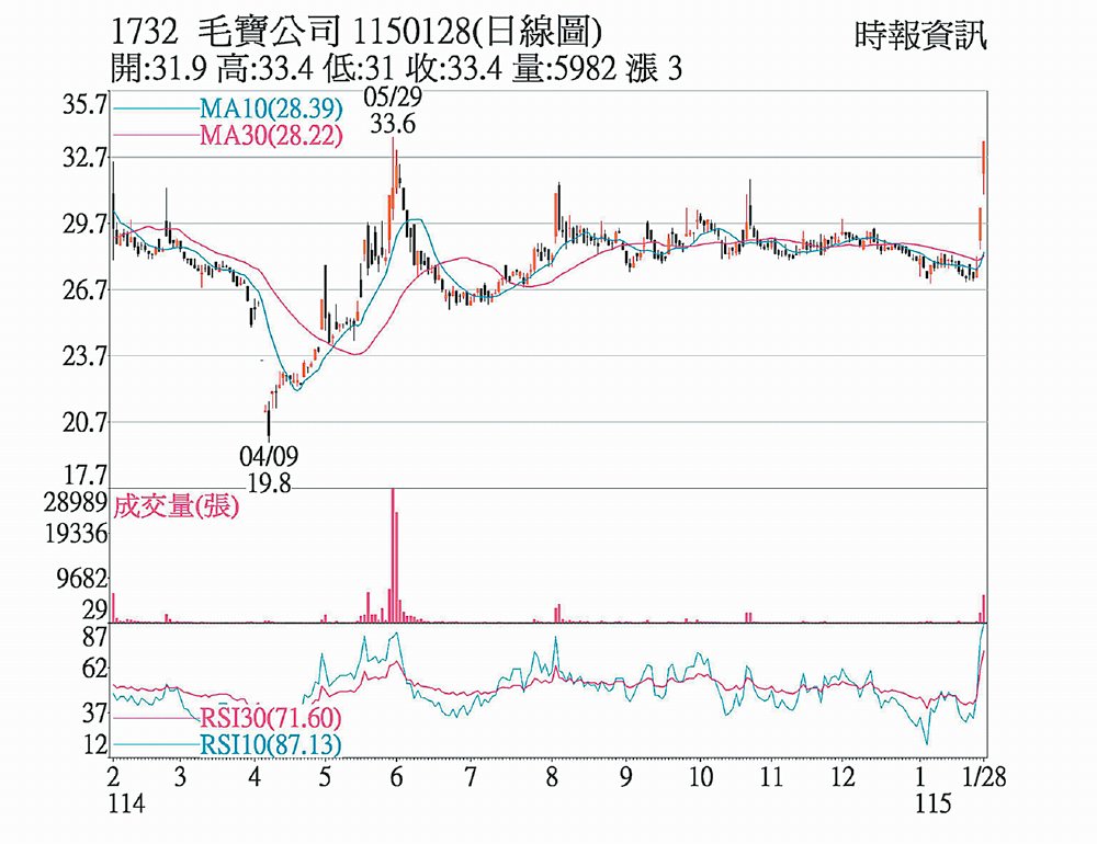 毛寶(1732)因近日印度通報立百病毒感染、並被列為法定傳染病,資金湧入防疫概念股,28日跳空開高,不久即亮燈漲停33.4元價位並鎖至終場,成交5,966張為近半年來大量。近半年來約在27~28元附近橫盤整理,近二日隨疫情消息吸引買盤進場,連續二根紅K突破短中長均線,並呈多頭排列,股價並創近半年新高,毛寶過去走勢與防疫題材高度相關,疫情變化將影響後續走勢。