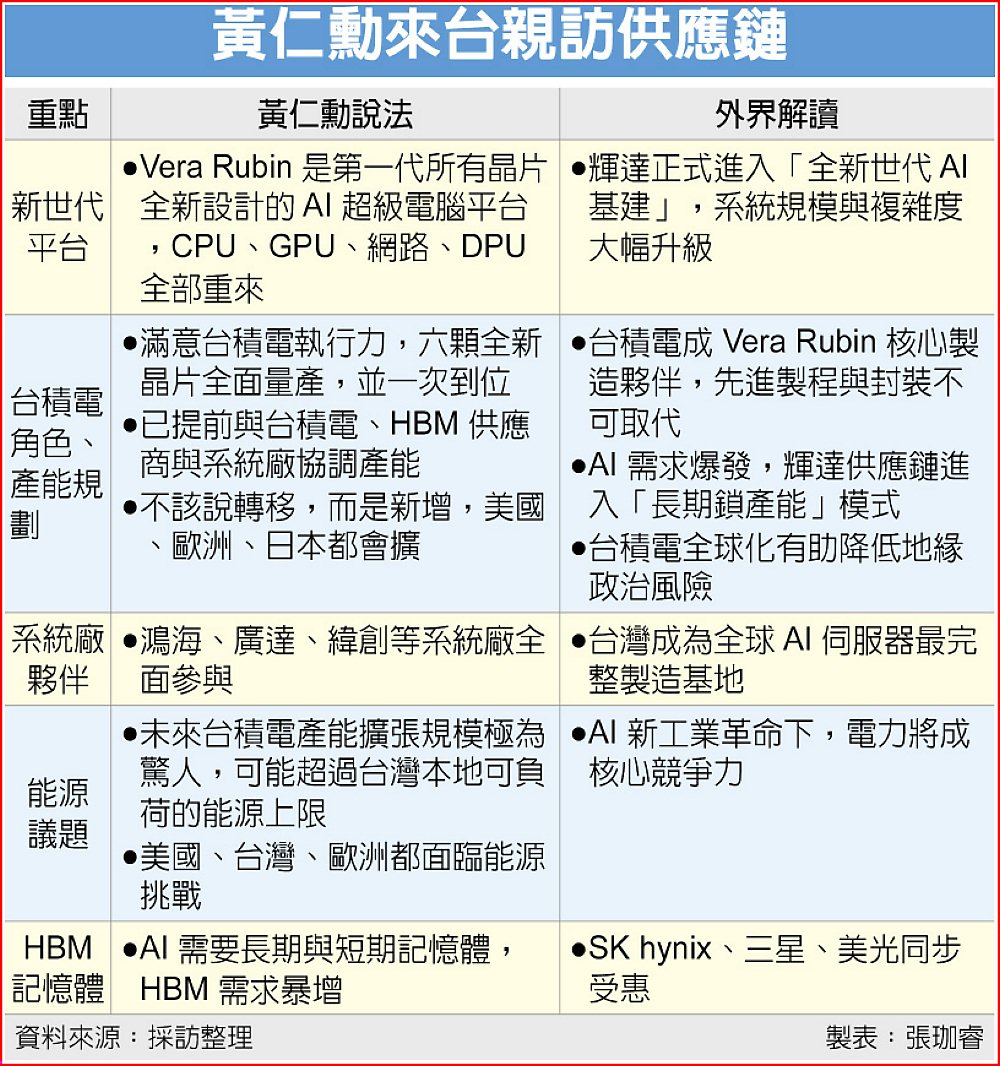輝達新一代Vera Rubin平台是首個「所有關鍵晶片全部重新設計」的世代,涵蓋全新Vera CPU、Rubin GPU,以及CX8網路晶片、NVLink交換器、Spectrum-X交換器與BlueField DPU等。他強調,目前相關晶片均已進入全面量產階段,對台積電執行力「非常非常滿意」。