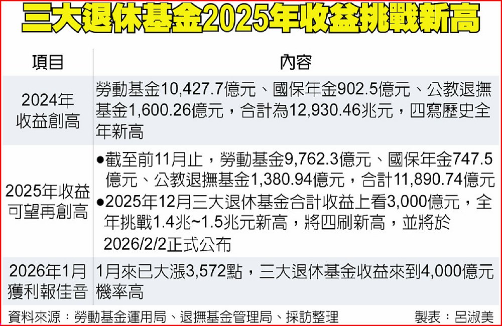 據勞動基金運用局及退撫基金管理局之前公布,2025年前11月勞動基金及國保年金收益各為9,762.3億元、747.5億元,公教退撫基金為1,380.94億元,合計已達1.19兆元,由於12月美台股市續大漲並創高,估計加計12月收益,全年將挑戰1.4兆~1.5兆元歷史新高,再刷2024年的1.29兆元的新紀錄。