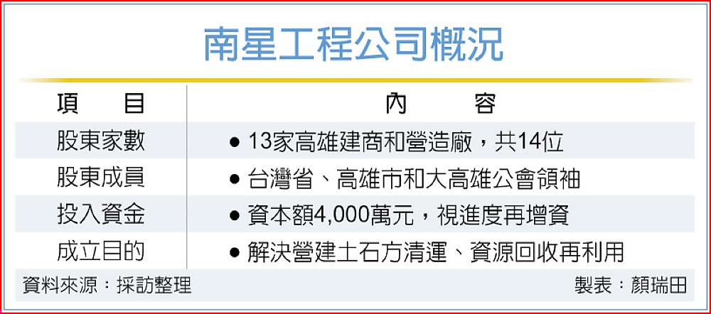 為反制土資場哄抬收價,造成土方處理成本飆增,台灣省、高雄市、大高雄三建商公會團體核心成員共14人,合組南星工程公司,由國城建設創辦人洪平森擔任董事長,將投資數億元,投入B點的土資場經營,並跨入營建廢棄物的資源回收再利用,最快上半年開始清運、處理營建土石方和廢棄物,讓市場回歸正常。