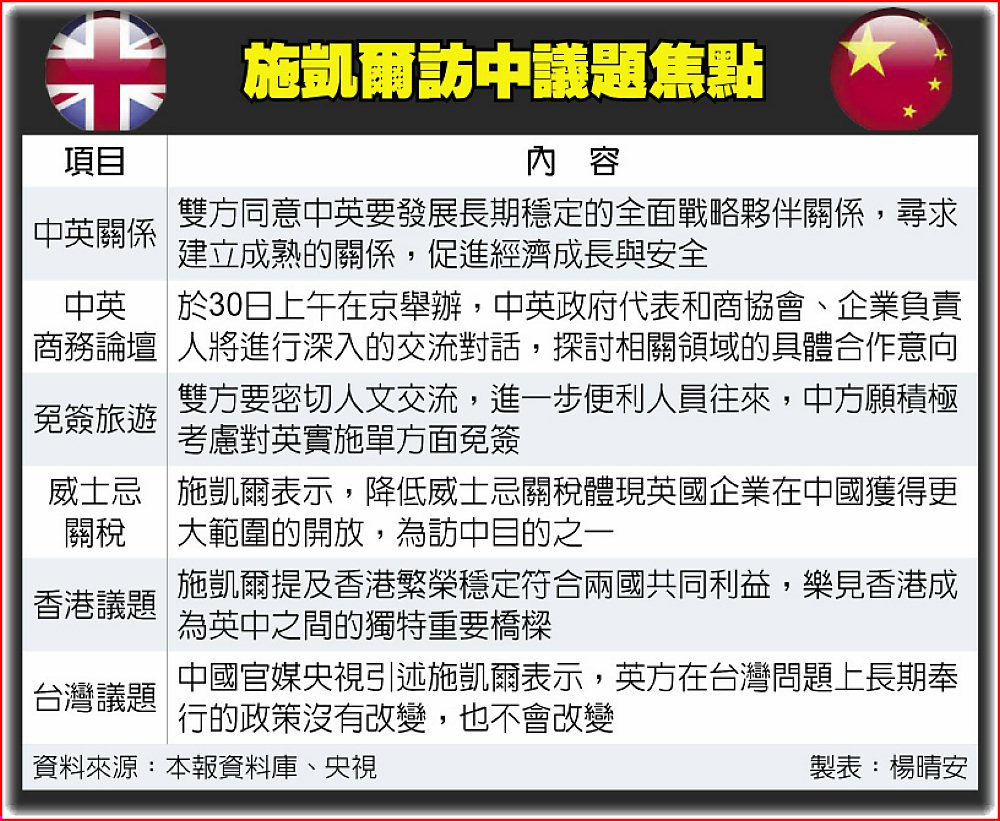 綜合陸港媒體報導,中英領導人會晤時長約80分鐘,議題涵蓋貿易、投資和國家安全等,在美國總統川普關稅戰以及地緣政治不穩定影響下,中英皆有意修復過去多年的緊張關係,有英國媒體將此形容為「重要外交時刻」。施凱爾本次訪中行程自28日開始,為期四天,隨後將前往亞洲行第二站日本。