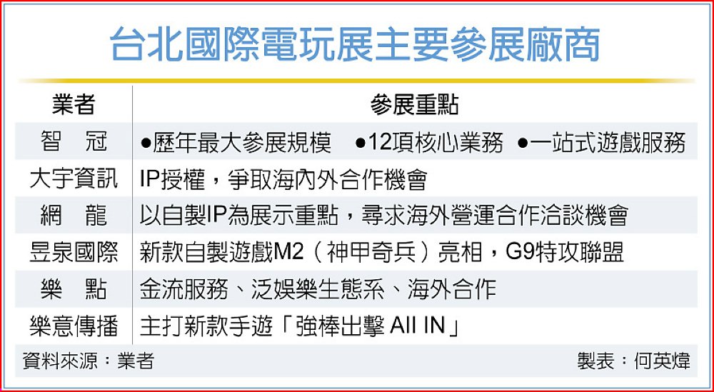 上市櫃遊戲公司智冠(5478)、大宇資訊(6111)、中華網龍(3083)、昱泉國際(6169)、樂意(7584)均積極參展尋求海外代理、IP授權及跨產業合作等商機。