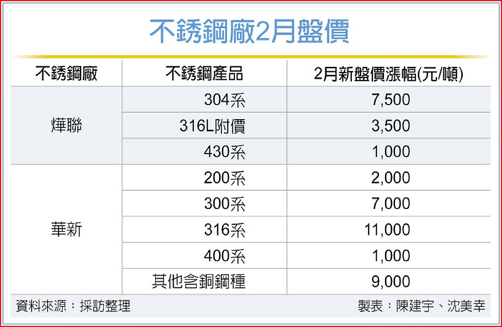 華新同日也開出2月新盤,漲勢更猛,其中316系一口氣大漲1.1萬元(每噸),其餘包括300系每噸漲7,000元,含銅鋼種漲9,000元,200系漲2,000元,400系漲1,000元。
