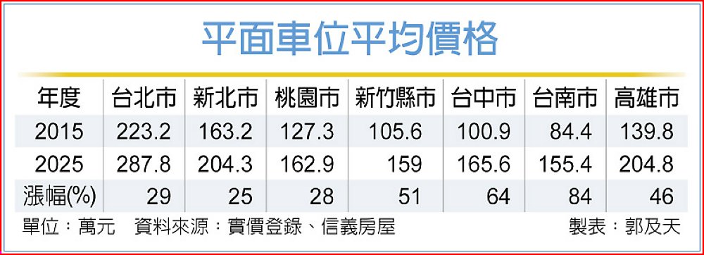 台灣都會區房價高漲,連帶停車位身價也水漲船高,尤其雙北外以城市車位價格出現驚人漲幅,過去十年平面車位均價從「國產車價」跳升至「進口車價」,如台南市平面車位從84.4萬元上漲至155.4萬元、高雄市從139.8萬元飆升至204.8萬元,反映出南部地區隨新建案推案與房價補漲,停車位價值正被重新定義。