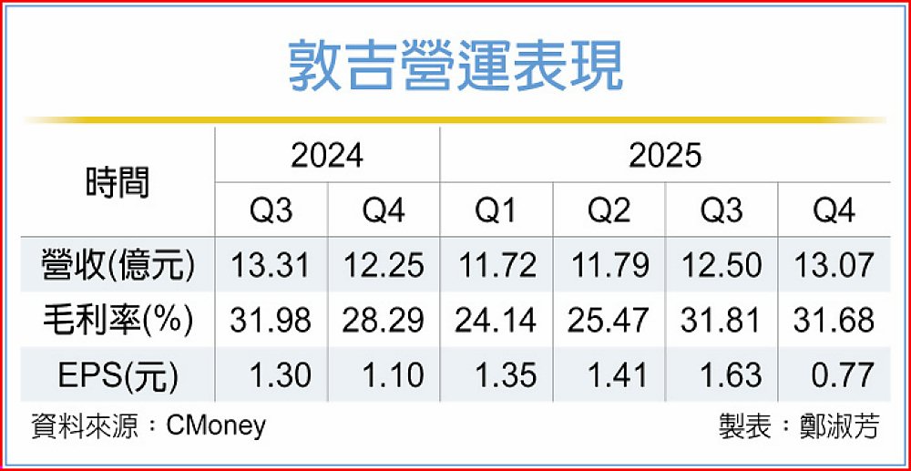 拜旺季所賜,帶動客戶需求升溫,敦吉(2459)2025年第四季合併營收13.07億元,呈季增5%、年增7%雙成長,營業毛利4億1,412萬元,季增4%、年增20%,單季毛利率達31.68%,惟受到子公司匯回股利須課徵所得稅,推升當期稅負,稅後純益僅8,450萬元,單季EPS 0.77元,另去年全年EPS 5.16元,仍樂賺半個股本。