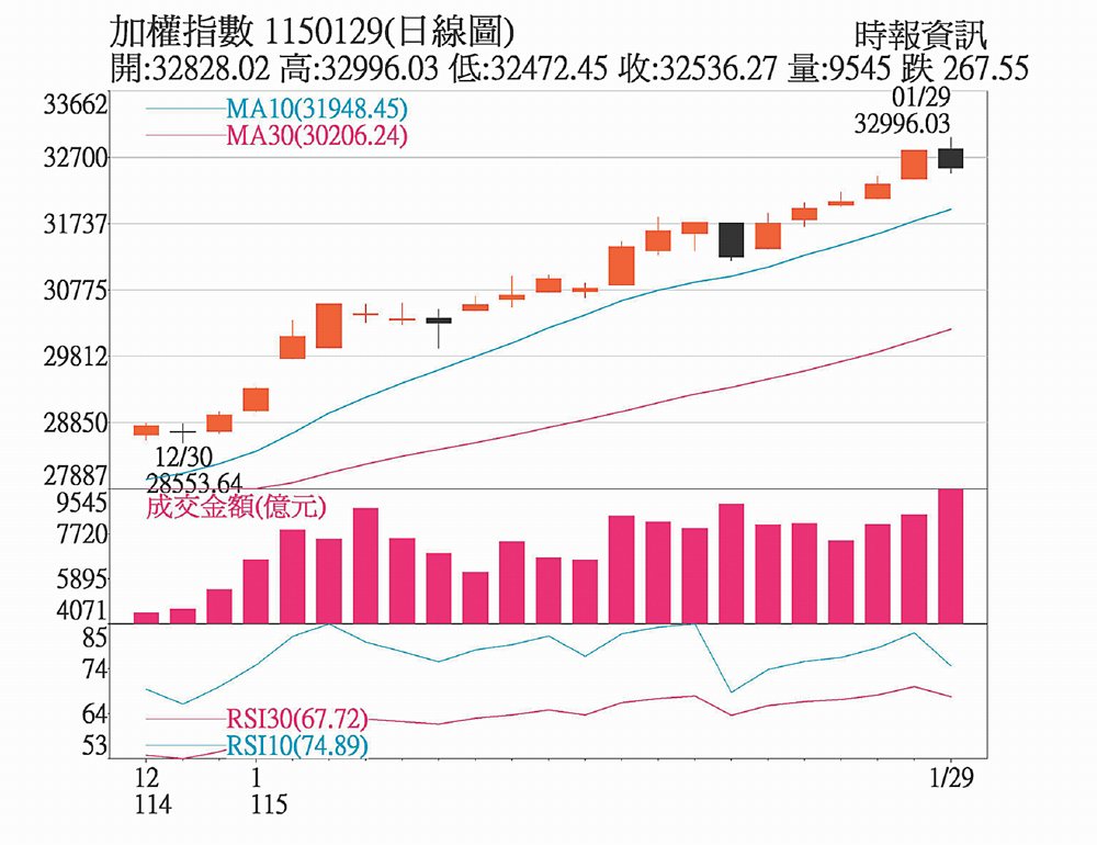 市場分析:1月台股除了延續12月上漲行情,甚至於還大幅超越,主要是台積電(2330)月中有法說會行情推升,加上台灣關稅降到15%等利多,且在月底時,美元指數走弱勢,也推升新台幣走升,讓台股高檔又有外資等資金挹注,在美國等半導體個股走強之下,台灣科技股受惠,當然也助台股將來挑戰33,000點大關。