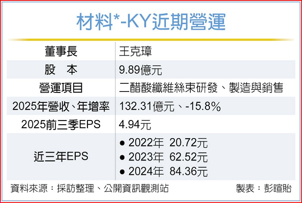 材料*-KY(4763)宣告五年發展新藍圖,面對全球貿易與地緣政治變動,將持續推動成本優化與永續材料研發,擴展絲束、傳統醋酸纖維長絲產能應用版圖。材料*-KY並與義大利Mazzucchelli合作擴展高端醋酸光學材料供應,切入智慧眼鏡供應鏈,亦已進入多家大陸品牌的AI眼鏡供應鏈,產品應用超出眼鏡框向多樣化材料延伸。