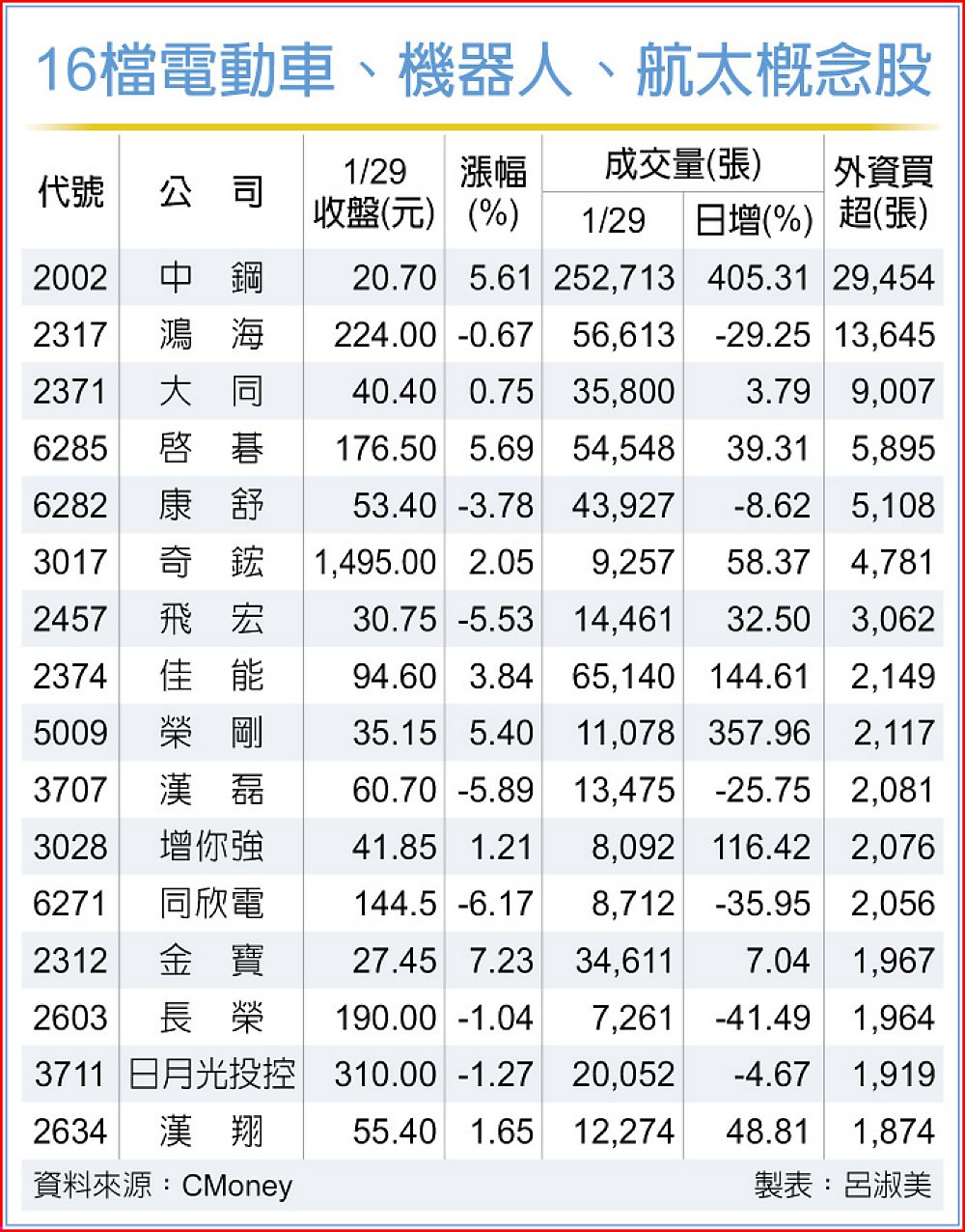 據統計,外資29日鎖定具有基本面利多的電動車、機器人及無人機等相關個股加碼,其中,中鋼及鴻海各買超29,454張及13,645張最多,另著墨大同、啟碁、康舒、奇鋐、飛宏、佳能、榮剛、漢磊、增你強、同欣電、金寶、日月光投控及漢翔等,都在約2,000張至9,000張。