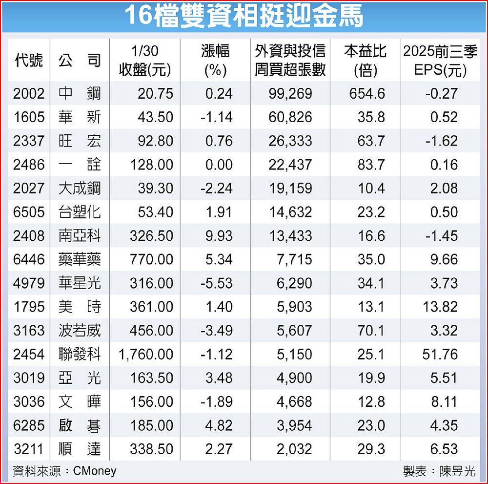 據統計,盤面上符合外資、投信近一周偏多掃貨,年前布局心態轉趨積極,帶動成交動能放大的個股,包括中鋼、華新、旺宏、一詮、大成鋼、台塑化、南亞科、藥華藥等16檔,受惠雙資力挺,股價具向上表現的空間。
