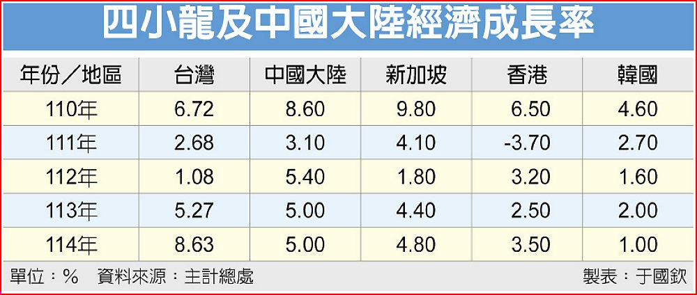 主計總處表示,去年四小龍經濟成長以台灣8.63%最高,新加坡4.8%、香港3.5%、韓國1.0%。去年台灣人均GDP達39,477美元,江心怡表示,依去年10月國際貨幣基金(IMF)估計,去年韓國35,962美元、日本34,713美元,台灣已超越日、韓。主計總處表示,台灣人均所得之所以超越日、韓,除了經濟成長優於日、韓,新台幣匯率升幅較高也是原因。