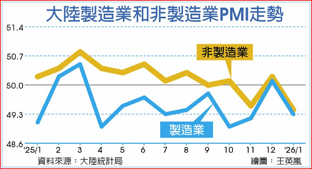 大陸製造業進入傳統淡季,再加上市場有效需求不足,使2026年1月大陸製造業景氣再度回落至收縮區間。大陸統計局1月31日公布,1月製造業採購經理人指數(PMI)降至49.3,較上月下滑0.8個百分點,遜於市場預期,非製造業PMI亦回落至49.4。專家認為,經濟回升基礎性動力亟待加強。