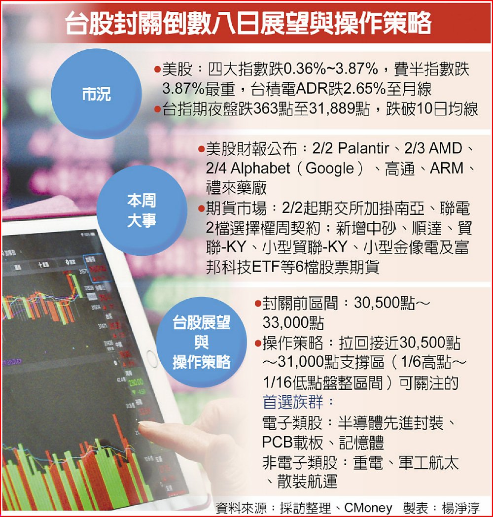 市場將美國總統川普提名的下屆聯準會(Fed)主席華許(Kevin Warsh)視為偏鷹派人選,美股30日重挫,台積電ADR跌2.65%,台指期夜盤跌363點至31,889點。法人認為,本波回檔屬於股市評價的校正,距離農曆年封關僅剩下八個交易日,預期台股將在30,500~33,000點之間震盪,操作上可待接近支撐區間時介入抱股過年標的,聚焦六大族群。