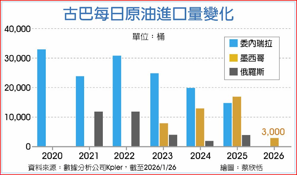 古巴每天僅能生產約4萬桶石油,但每日石油需求高達10萬桶。委國已停止每日向古巴輸送的3.5萬桶石油。墨西哥每日輸送量也從2025年平均2萬桶降至如今的3,000桶。