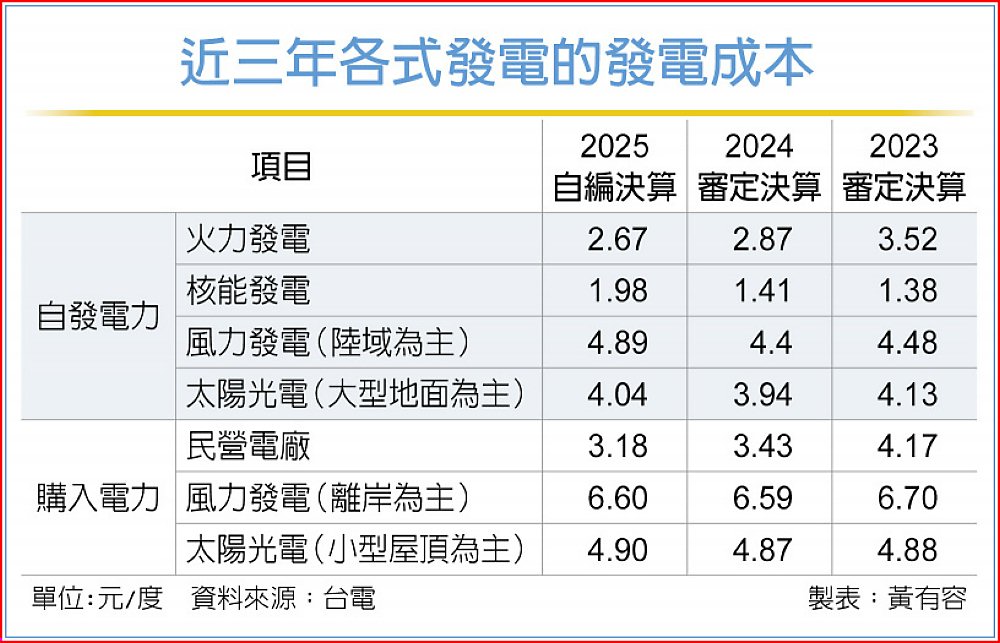 另外,已於2025年5月全部停止發電的核能發電,成本則為每度1.98元。