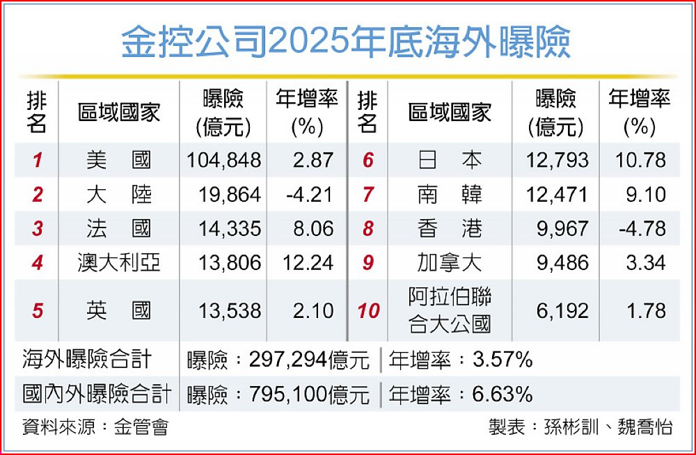 金控公司海外曝險穩定成長,金管會最新公布,截至2025年底,金控海外曝險達29.73兆元、創歷史新高,年增3.57%,其中對美國曝險連續43季居冠,且金額重返10兆元大關,達10.48兆元、年增2.87%,另前十大曝險國成長達雙位數有澳大利亞、日本,年增各12.24%、10.78%。