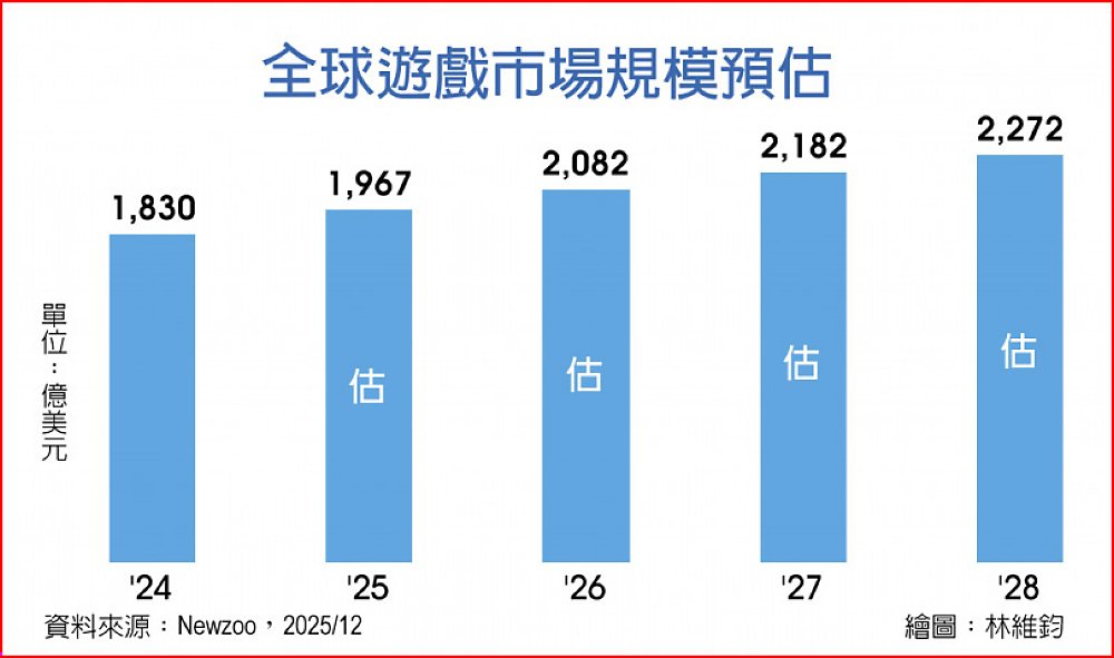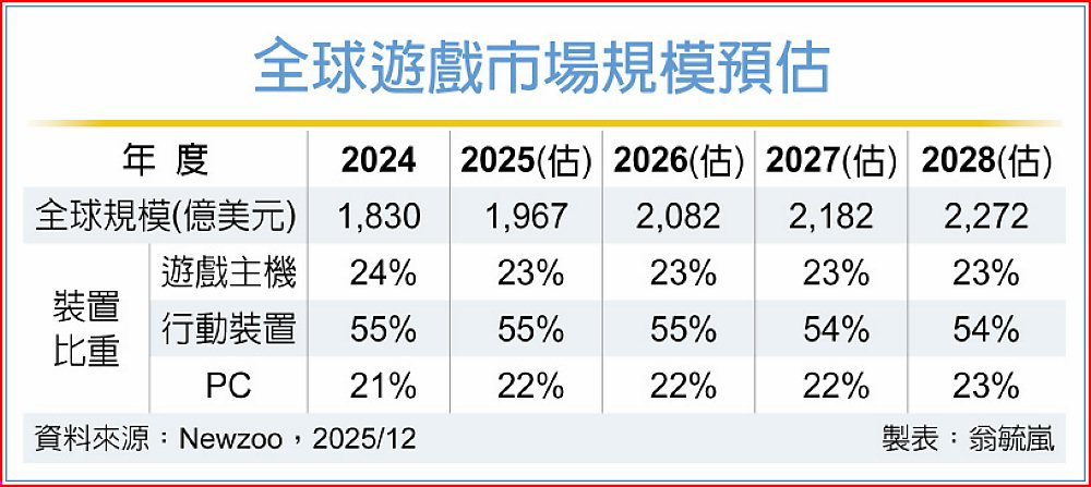 根據遊戲市調機構Newzoo的最新調研數據,2025年來自於PC及行動裝置遊戲市場動能優於預期,拉抬全年度全球遊戲產業市場規模估以7.5%的年增率,達上看1,970億美元、再創新高。