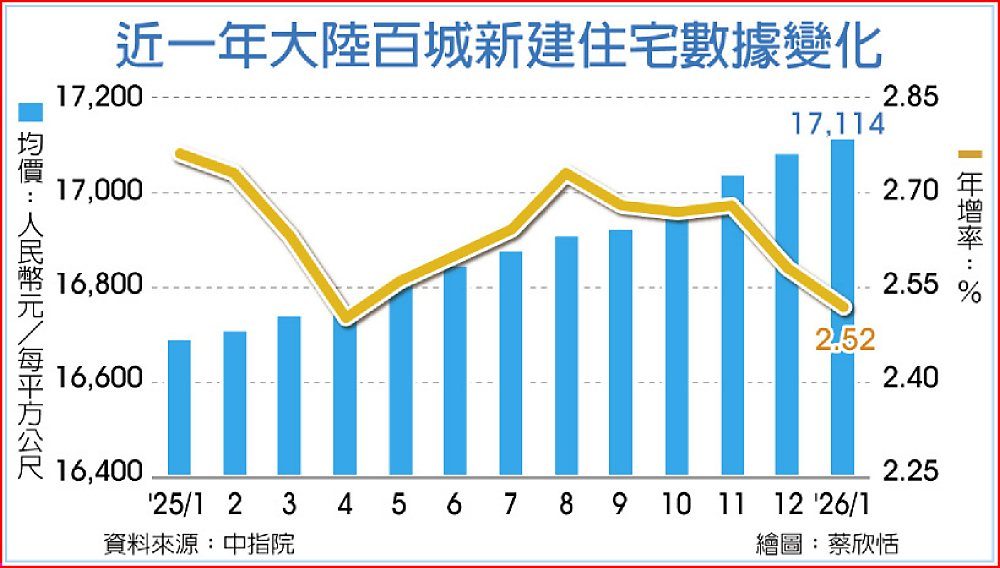 綜合陸媒報導,中指院的報告顯示,1月大陸100個城市新建住宅平均價格為每平方公尺人民幣(下同)17,114元,月增0.18%、年增2.52%。二手住宅均價則是每平方公尺12,905元,月減0.85%,跌幅較2025年12月收窄0.12個百分點,年減8.67%,顯示跌勢有所收斂。與此同時,也凸顯出1月份大陸新建住宅與二手住宅,仍然延續分化走勢。