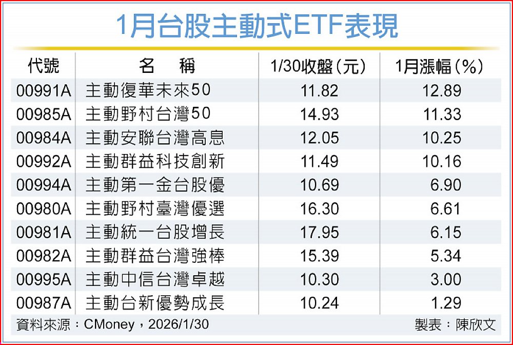 台股大盤元月收在32,063.75點,單月大漲3,100.15點或10.7%,創史上單月最大漲點,連帶主動式台股ETF買氣增溫,以績效來看,統計1月10檔主動式台股ETF中有四檔報酬率超過1成,和大盤相比,有兩檔勝出。