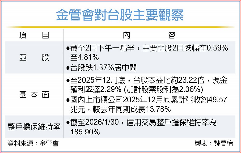證期局觀察,台股2日跌幅介於主要亞股中間。台股2月2日收盤指數為31,624.03點,下跌439.72點,跌幅1.37%,成交量約7,404億元,同時段(截至下午13點30分)亞洲主要股市狀況為韓國下跌4.81%、日本下跌1.03%、新加坡下跌0.59%、香港下跌2.79%、上海下跌1.69%。基本面方面,金管會認為,目前尚稱穩健,截至2025年12月底,台股本益比約23.22倍,現金殖利率達2.29%(加計股票股利為2.36%),國內上市櫃公司2025年截至12月底累計營收約49.57兆元,較去年同期成長13.78%。