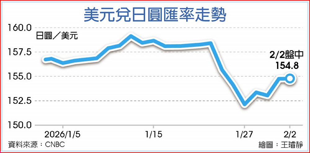 美元兌日圓匯率在1月30日升值逾1%後,於2月首個交易日盤中升勢縮小,僅小漲0.02%,報154.8日圓,顯示市場觀望氣氛濃厚。